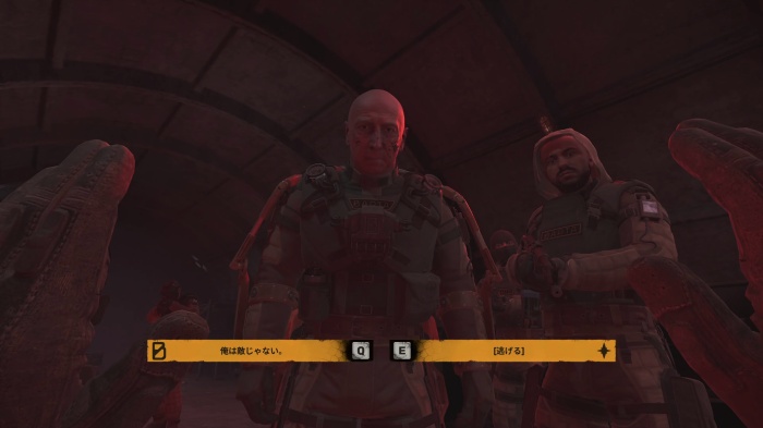 ダクトを通るとムービーです。ここでの選択肢は重要な選択肢で「俺は敵じゃない」を選ぶとウォードエンディングが確定します。それ以外のエンディングに行きたい場合は「逃げる」を選んでください。