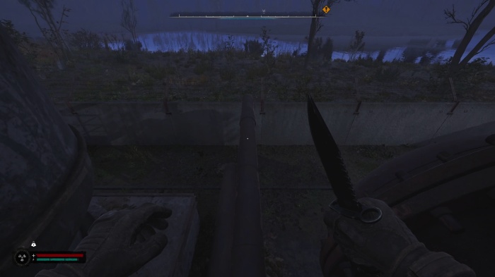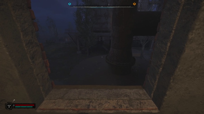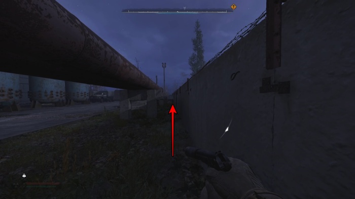 ハシゴを上がったらパイプに飛び降りて敷地外にダッシュジャンプで有刺鉄線を飛び越えましょう。