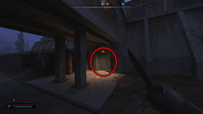 後は左の壁沿いを進んでいくと装備がある建物に到着します。