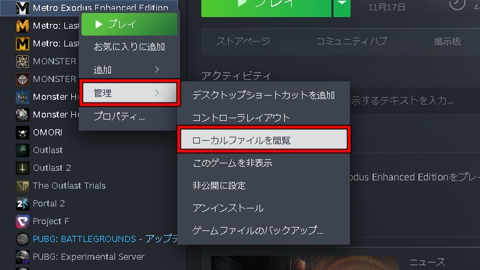 steamを開き「ライブラリ」を押します。左側に自分が持っているゲームが表示されるのでS.T.A.L.K.E.R.2を右クリック→「管理」→「ローカルファイルを閲覧」を選択します。(編集者はgame pass版でプレイしているので写っているゲームが違います)