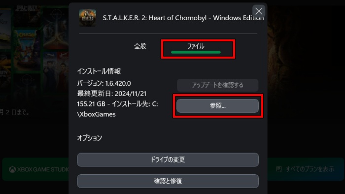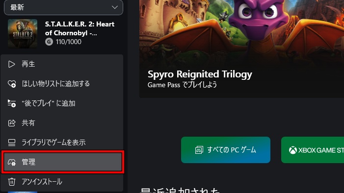 xboxアプリを開き、左側に表示されているS.T.A.K.E.R.2を右クリック→「管理」を左クリック