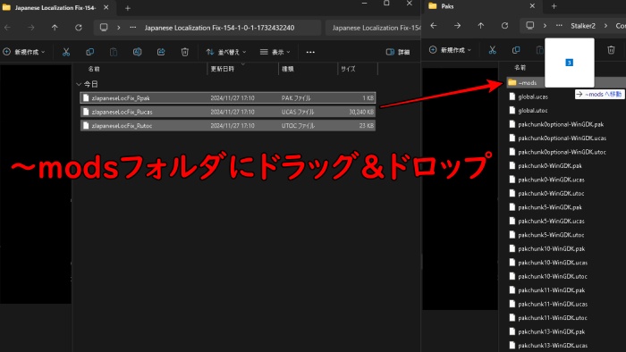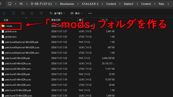 Paksフォルダの中に「~mods」という名前のフォルダを作りましょう。新しいフォルダは何もない所を右クリック→「新規作成」→「フォルダー」から作成できます。注意点として~を忘れるとmodが機能しないため、ちゃんと~modsという名前をつけてください。
