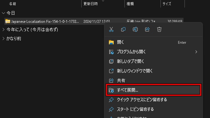 ダウンロードができたらフォルダを右クリック→「全て展開」を選択しましょう。参照先はそのままで大丈夫です。