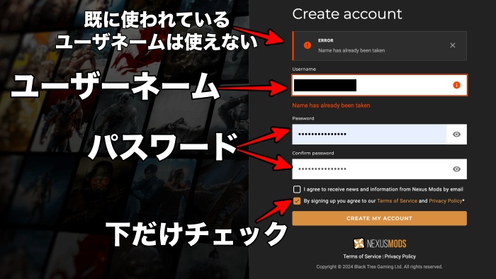 ユーザーネームとパスワードを設定します。チェックボックスは下だけチェックをつければokです。(nexus modsのニュースなどを受け取りたい方は上もチェック)プレミアムの勧誘をされますが、無視して大丈夫です。これでアカウント作成は完了です。