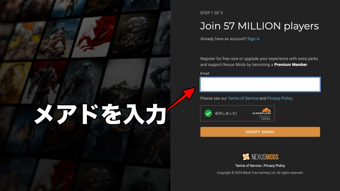 modをダウンロードするサイト「Nexus mods」にアクセスし、アカウント作成とサインインを済ませましょう。無料なので安心してください。