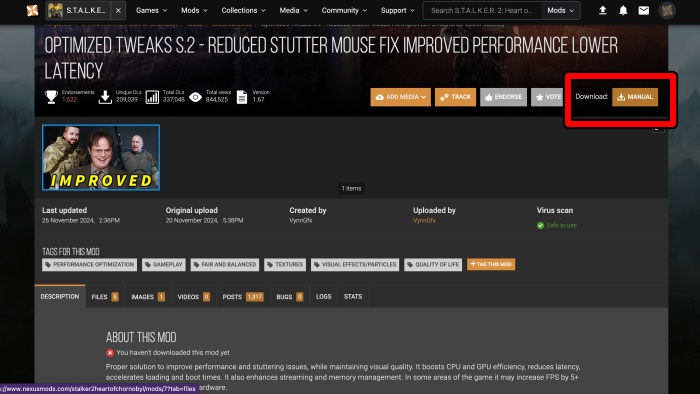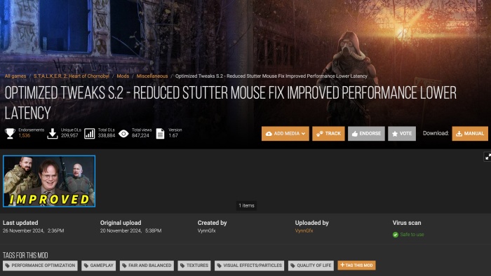 Optimized Tweaks S.2はパフォーマンス問題を改善するMODです。STALKER2のMODの中でも非常に人気なMODになっています。