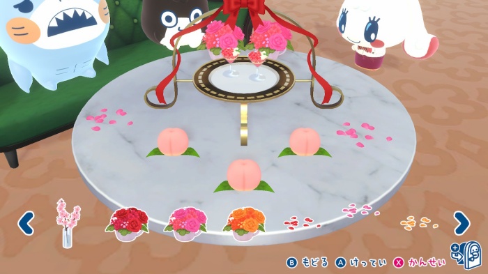 テーブルに飾り付けをしていきましょう。指定された果物は必ず置き、後は注文された雰囲気にあった花などを配置します。