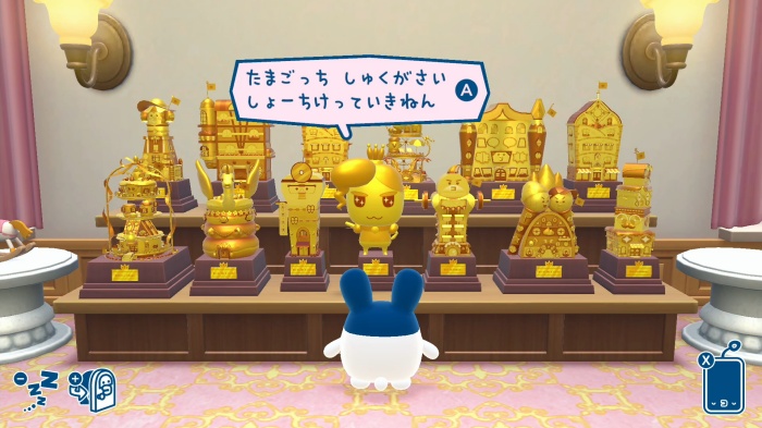 マイハウスの奥にある棚にトロフィー「たまごっち しゅくがさい しょーちけっていきねん」が追加されます。調べるとエンドロールをもう一度見ることができます。