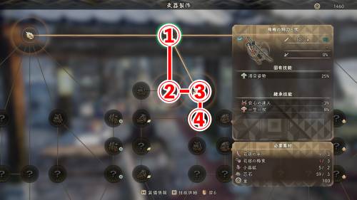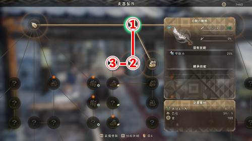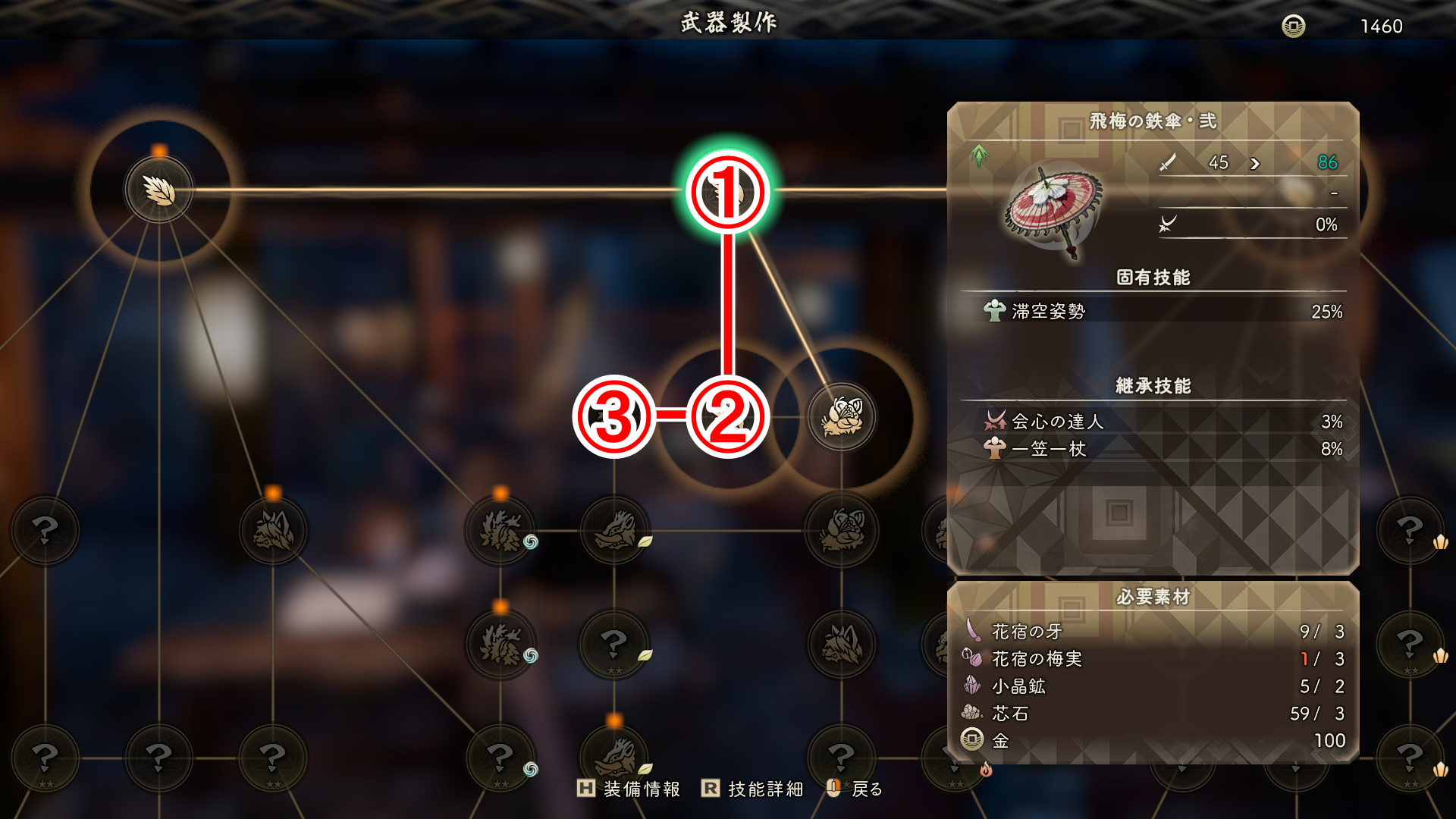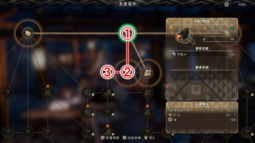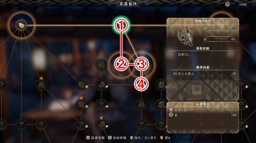 初花の刀を経由して強化派生すると技能(スキル)「猛攻」を継承することができます。