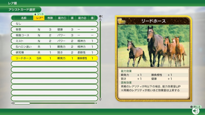 特定のアシストカードを使用すると一部の名馬カードが排出されやすくなるなど、安定して強い馬を作るためには、かなり重要な要素となる。